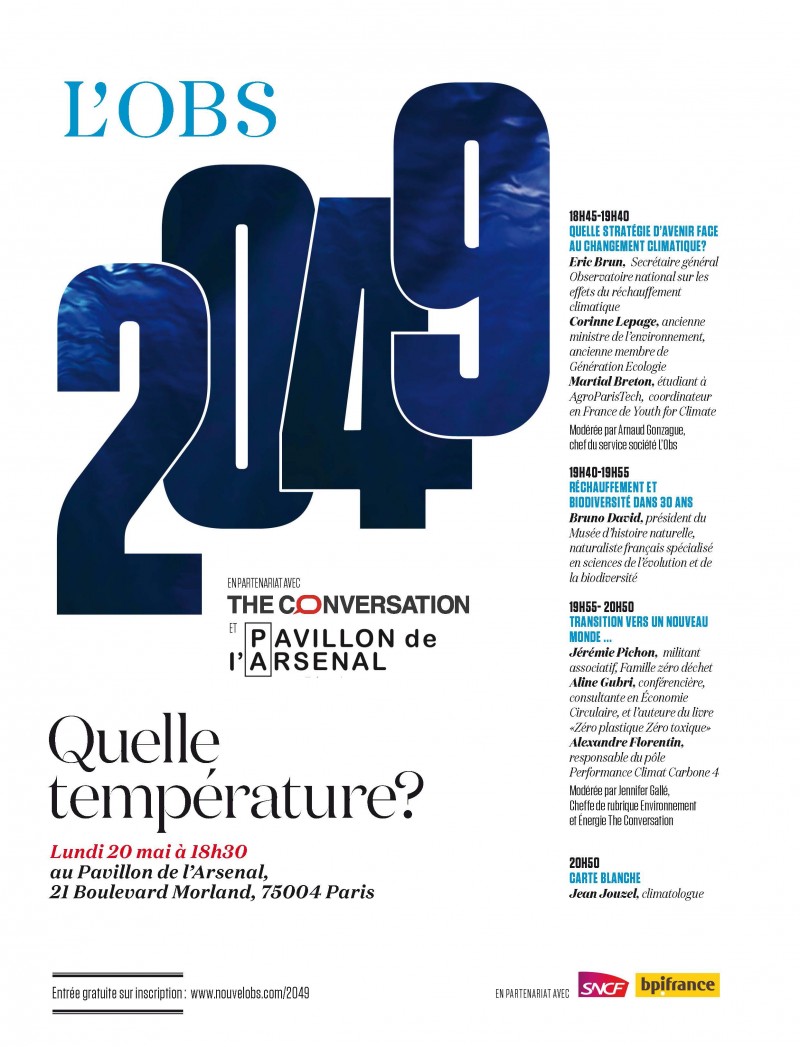 Le Pavillon de l’Arsenal s’associent au cycle de rencontres organisé par l’Obs tout au long de l’année 2019, afin d’explorer et de questionner les scénarios du futur avec les meilleurs experts. Trois grandes soirées pour trois grands enjeux de notre société contemporaine : Quelle température en 2049 ? Comment se déplacer en 2049 ? Où et comment habiter en 2049.