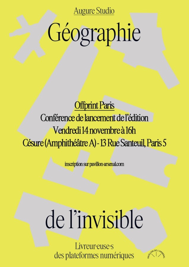 À cette occasion, le Pavillon de l'Arsenal proposera le vendredi 14 novembre une conférence d'Augure Studio, pour le lancement de l'édition Géographie de l'invisible dédiée aux livreur.euse.s des plateformes numériques, publiée dans le cadre du programme de recherche FAIRE.