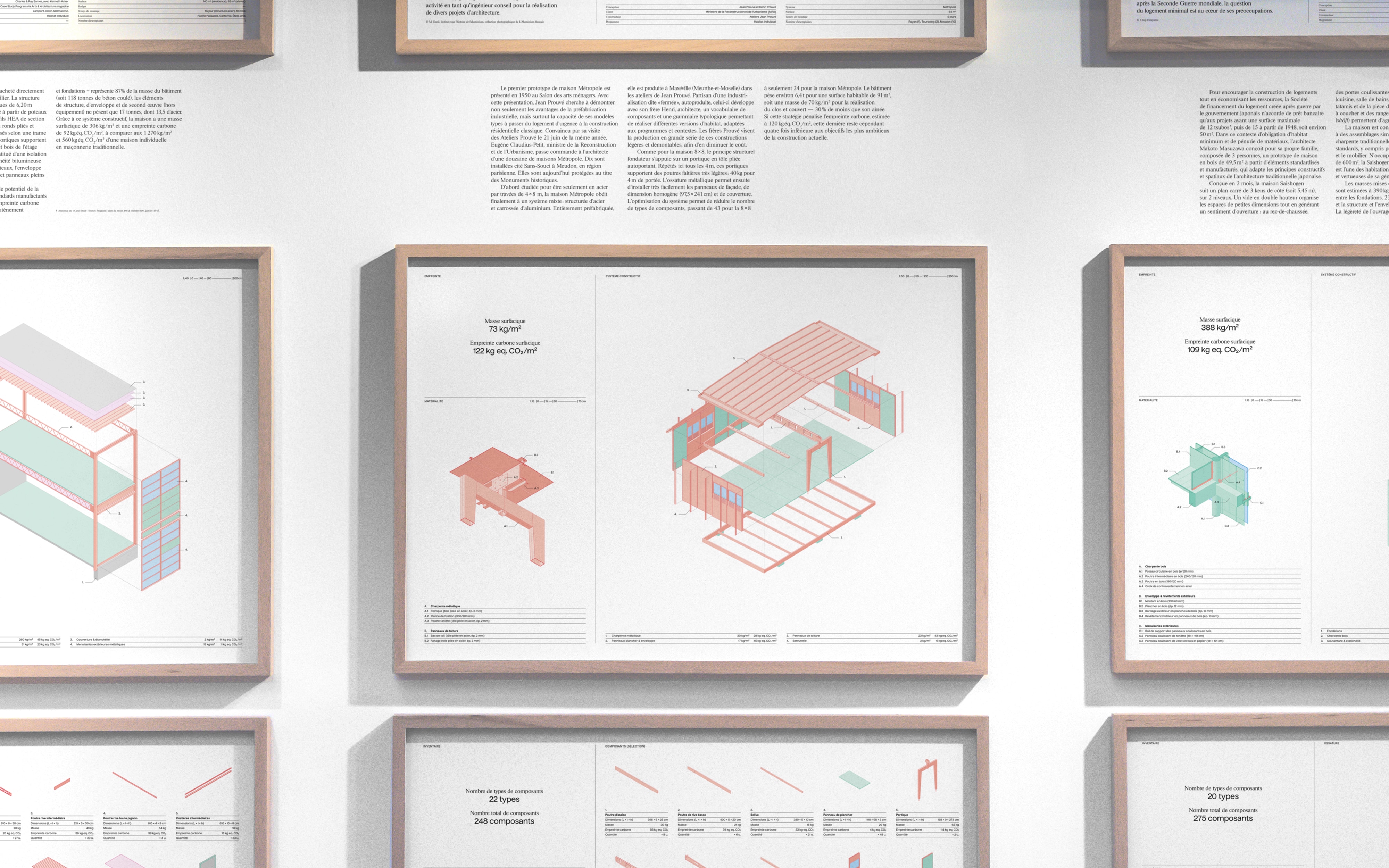 Présentée chronologiquement autour de la maison 8x8 BCC « tout bois » - conçue par Jean Prouvé et Pierre Jeanneret et prêtée par la Galerie Patrick Seguin dont les éléments servent d’étalon, l’analyse offre aussi pour la première fois l’opportunité de mettre en regard l’estimation des masses, des composants, des systèmes constructifs des bâtiments et leur empreinte carbone, pour les comparer entre eux et aux constructions classiques. Les résultats édifiants tournent systématiquement à l’avantage des architectures légères. La masse moyenne au mètre carré des maisons présentées ne dépasse pas les 300 kg /m2 quand les pavillons actuels atteignent aisément 1200 kg /m2. Leur empreinte carbone moyenne corrigée est évaluée à 282 kg CO2.eq/m2, alors que l‘objectif de la nouvelle réglementation est de 640 kg CO2.eq/m2 avec l’ambition d’être limité à 415 CO2.eq/m2 à partir de 2031.