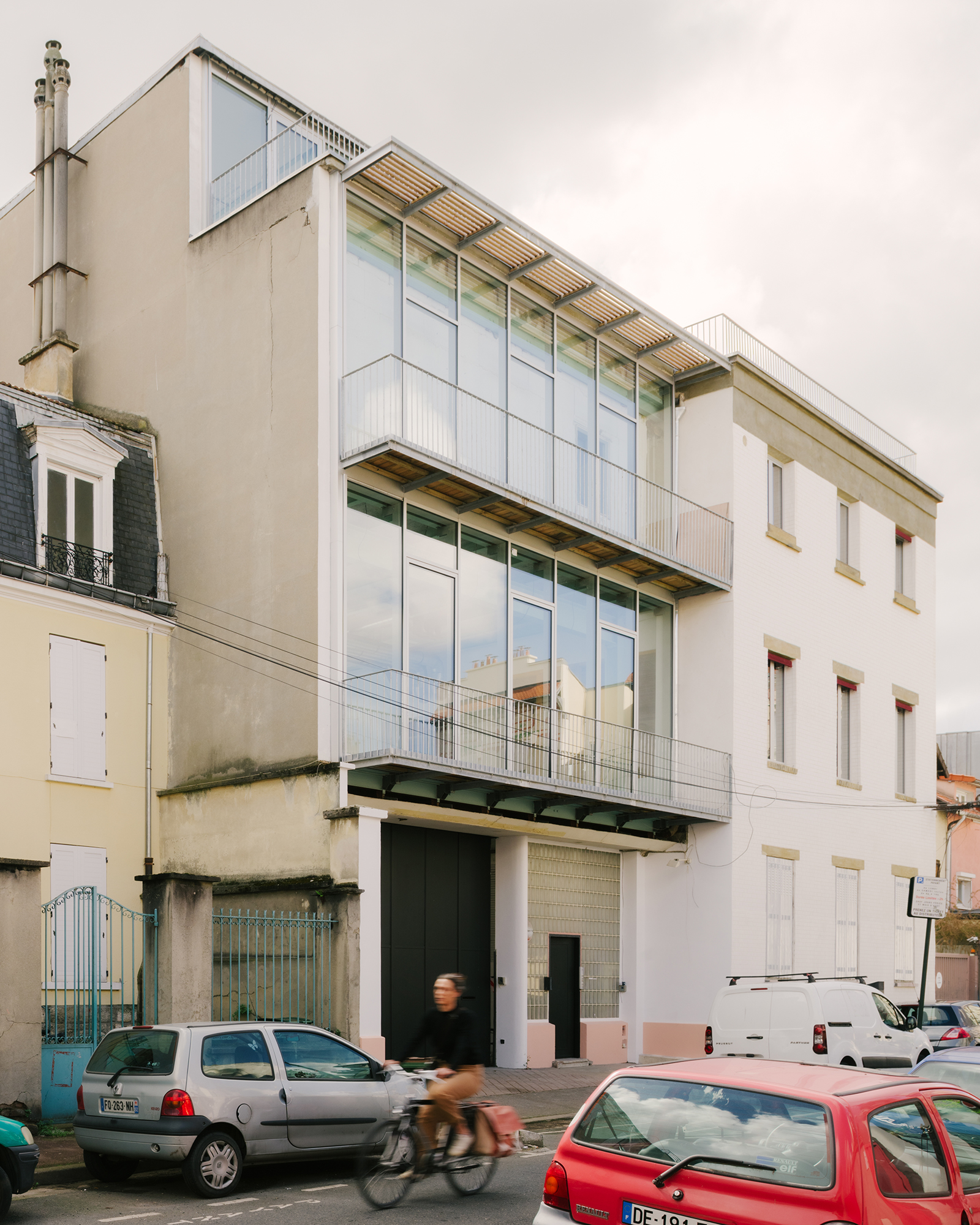 La construction initiale, datant du début du 20ème siècle, est débarrassée de l’enduit afin de retrouver la composition de la façade et la brique d’origine, lui redonnant son identité forte de lieu de production. L’extension des années 50, comprenant le bâtiment pont et la surélévation, est habillée d’un nouveau mur-rideau pour remplacer l’existant amianté. Au-dessus de l’entrée, le projet profite du retrait de cette extension pour installer des balcons en console reprenant l’alignement sur rue. Ces espaces « en plus » offrent une nouvelle qualité aux locaux et un espace extérieur à chaque étage.